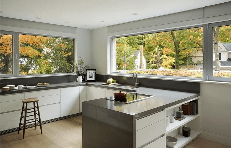 - мінімалізм – один із найпоширеніших дизайнів інтер’єру. Він набув високої популярності завдяки своїй простоті. У стилі мінімалізм немає декору, а палітра кольорів кухні стримана в одному кольорі. Також властиве чітке дотримання геометричних форм. У результаті виходить простора і функціональна кухня, в якій немає зайвих дрібних деталей;